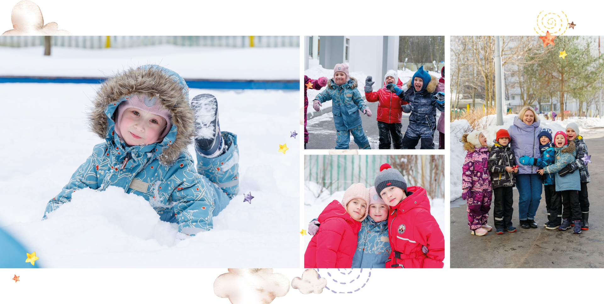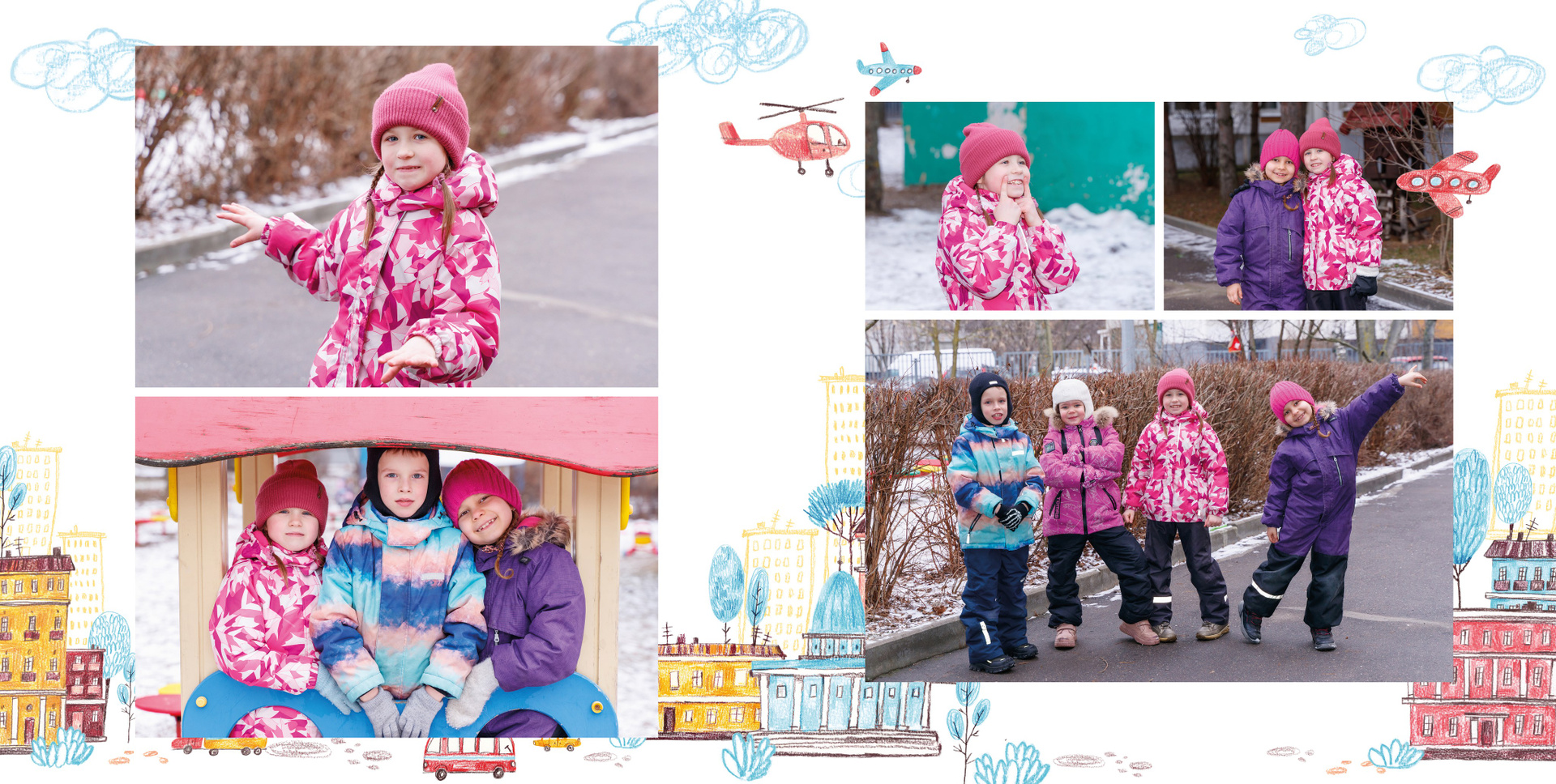 - Индивидуальный разворот с репортажной съемки прогулки (2-4 фото)